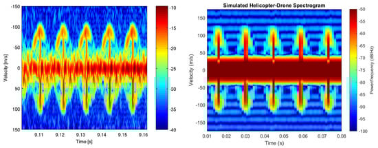 Real and simulated spectrogram of the helicopter drone. Adapted from [21].