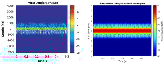 Another comparison is reported in Figure 5 where the spectrogram of a real quadcopter drone with blades for each rotor, from the work in [22], is compared with the simulated quadcopter drone spectrogram, by using the proposed model. The real quadcopter drone is characterized by a blade length about cm and a rotation rate of the rotor blades about rev/s. In the spectrograms it is possible to appreciate the contribution of the main body, centred at the Doppler frequency Hz, and the micro-Doppler contributions of the blades represented by the blade flashes.
