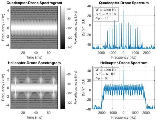 Even in the case of the drones, that have very short and thin blades, the rotation of the propeller blades is sufficient to generate clear micro-Doppler signatures. In particular, the works in [5,6,18] showed that an analysis of the radar return can be used to distinguish drones from birds.