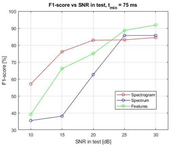 Performances when varying the in test are reported in Figure 10. It is possible to notice that, as expected, increasing the improves the performances of all the classifiers. In particular, for dB, the most performing approach results to be the one in which the spectrogram samples are given as input to the neural network. Instead, when the is sufficiently high to correctly reconstruct the spectrograms and spectra of the targets, the performances of the three approaches become comparable and stable around 85%, with the approach of the features that is slightly better than the spectrogram and spectrum approaches.