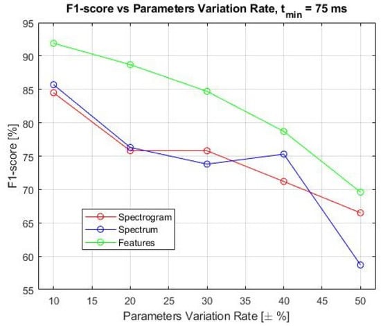 As mentioned before, the three approaches are also compared by varying the range of values of the target parameters in test, in order to emulate different drone models or flight behaviours. The -score versus the parameters variation in test is reported in Figure 11. As expected, the performances of the classifier get worse if the range of variation of the target parameters increases. In fact, the greater is the range of values in which a parameter varies, the more two different categories of targets tend to be confused. As an example, consider the case of the two drones: when the blade length of a quadcopter drone is varied of about ±50% with respect to its reference value, it is highly probable that the received signal from the quadcopter drone is similar to the received signal from the helicopter drone, leading to subsequent classification errors. It is also interesting to notice that, with the parameters variation rate fixed, the spectrogram and spectrum approaches have an almost equivalent behaviour, while the approach of the features gives much better classification results. In any case, the classification performance is still good also with a parameter variation of about 40%.