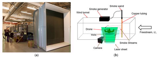 Flow visualization and PIV experiments were conducted in the NMSU low-speed wind tunnel, shown in Figure 1a, which has cross-sectional dimensions of 1.2 × 1.2 m. For the flow visualization experiments, an Aerolab smoke generator is used to feed smoke into the wind tunnel through copper tubing with small holes to generate smoke streaks. To illuminate the streaks, a 532 nm, 200 mW continuous wave laser is placed beneath the wind tunnel that is equipped with a 60-degree Powell lens to generate a laser sheet. A schematic of the flow visualization and PIV setup is provided in Figure 1b where the multi-rotor UAV is mounted to simulate forward flight with an arrow indicating U∞, the freestream flow direction. Although flow visualization techniques are necessary to observe the perturbation of the flow due to the multi-rotor, it is not possible to observe the flow near the body in detail without PIV experiments which occurs over a much smaller field of view (FOV). The PIV system is composed of a dual-cavity Nd-YAG laser (15 pulses/s, 200 mJ/pulse), a high-sensitivity CCD camera (1.4 M pixel, 12-bit gray level), a synchronizer, and a computer to acquire and process images using DaVis 8 software (La-Vision, Inc., Göttingen Germany).