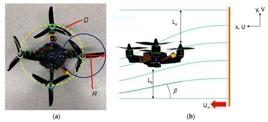 (a) The multi-rotor UAV used for all experiments including , the diameter of the multi-rotor UAV and , the radius of the propeller. (b) Multi-rotor UAV in simulated forward flight including the disturbance distance both below, and above, the multi-rotor UAV and the angle at which the flow is expelled from the front rotors, β.