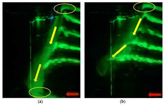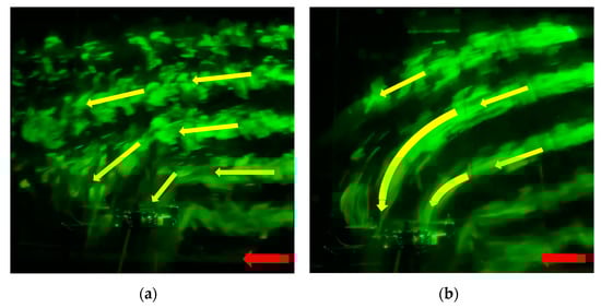 Flow visualization results from below the multi-rotor UAV in forward flight at = 5 m/s operating at (a) Retip = 3 × 104 ( = 0.54) and (b) Retip = 8 × 104 ( = 0.20).
