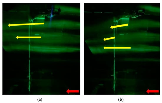To study the full range of potential flight conditions, experiments are run for —varying from 1 m/s to 5 m/s in 1 m/s increments—and the Reynolds number based on the propeller tip (, where denotes the angular velocity of the rotors (rad/s), represents the rotor radius, is the rotor chord, and is the kinematic viscosity of air) is varied from 3 × 104 to 8 × 104 in increments of 104. In the case of forward flight, the advance ratio is also commonly used to delineate the flow regimes as it considers the forward flight speed and rotor speed simultaneously where the advance ratio is , where is the rotations per second of the propeller. The advance ratios that correspond to the experimental flight conditions are 0.04 0.54. For the results shown in Figure 3 and Figure 4, the red arrow indicates the direction of while yellow arrows highlight and draw attention to significant flow features.