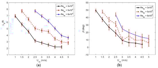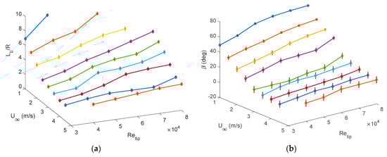 The results from all of the flow visualization experiments are shown in Figure 6. Each forward flight speed, 1–5 m/s in 0.5 m/s increments, is considered with varying Retip values, 3 × 104–8 × 104 in 1 × 104 increments, leading to an advance ratio range of 0.04–0.54. The disturbance distance below the multi-rotor, is shown in Figure 6a for different freestream speeds under consideration with varying Retip values with error bars, again based on 10-pixel uncertainty. Clearly, as is increased, the distance the wake disturbance propagates below the multi-rotor UAV decreases. As expected, as the rotor speed is increased, the disturbance distance increases. The error bars presented in Figure 6a are small compared to the overall scale of the plot being presented. The 10-pixel uncertainty under consideration is almost negligible when considering the full scale of observed over the full range of advance ratios. As the is increased, is substantially reduced, as seen in Figure 6b. Alternatively, as the rotor speed is increased for a constant , increases but is not as sensitive as in the case of a change in . Furthermore, at 2.5 m/s, approaches a constant value that is dependent on Retip. The errors in the jet angle are more considerable at low jet angles, as seen previously, but for the higher jet angles, the 10-pixel uncertainty is rather negligible. The trends seen in and are strikingly similar as expected given In both cases, different combinations of freestream speeds and rotor speeds result in similar outcomes which indicates that is dependent on the ratio of freestream speed to rotor speed, which is taken into account in the advance ratio.
