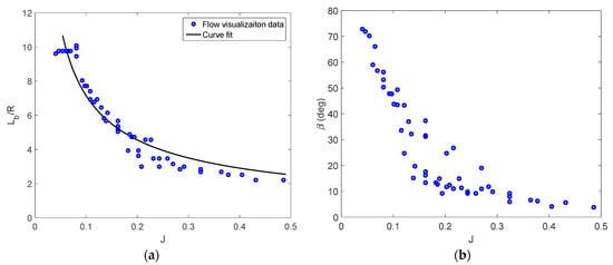 (a) Disturbance distance, ; and (b) jet angle, for varying advance ratios.