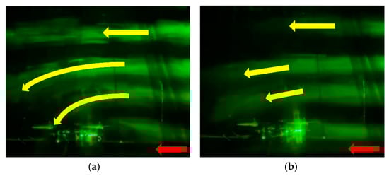 In addition to below the multi-rotor UAV’s body, during forward flight there is also a disturbance above the body as depicted in Figure 8a,b which show flow visualization above the UAV for = 1 m/s and Retip = 3 × 104 ( = 0.11) and Retip = 8 × 104 ( = 0.04), respectively. In each case, there is a deflection of the streamlines closest to the multi-rotor UAV as the freestream flow is pulled into the rotors. At the lower rotor speed, Figure 8a shows that although all of the streamlines above the vehicle are affected, in comparison to a higher rotor speed as shown in Figure 8b, they are less modified.