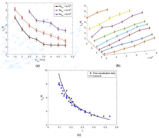 Lb/R and La/R at J = 0.10 and J = 0.55, and their corresponding ranges based on flow visualization expression.