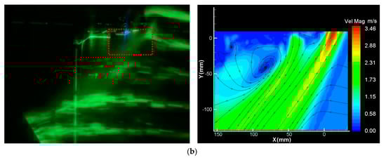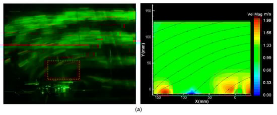 Unlike flow visualization, to obtain high-resolution quality PIV results, the size of the FOV is much more limited. Based on this, results from the flow visualization experiments are used to determine the optimal FOV location for the PIV experiments. Figure 11a,b shows the FOV designated by the red box for forward flight PIV experiments that was focused below and above the body of the multi-rotor UAV respectively. Both FOVs are selected to capture the detailed flow field in the vicinity of the body.