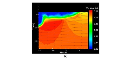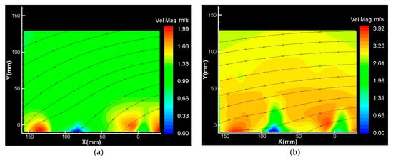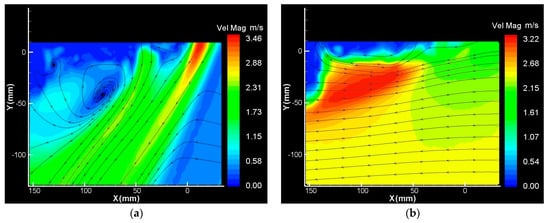 Considering low and moderate to high Retip values (low advance ratios), it can be seen in Figure 3 that the rotor wake dominates the flow, resulting in large disturbances below the multi-rotor UAV. Figure 3a shows the wake below the multi-rotor UAV with = 1 m/s and Retip = 8 × 104 ( = 0.04) which is the combination of the lowest simulated flight speed and highest rotor speed. This low and high Retip results in strong jets being expelled from the front rotors, beneath the multi-rotor, which extend to the tunnel wall, initiating wall effects that indicate this configuration is beyond the limit of the experimental configuration. As the rotor speed is reduced to Retip = 5 × 104, ( = 0.06), as shown in Figure 3b, there is still a noticeable jet from the rotors, but decreased considerably and is well above the tunnel wall. Furthermore, the angle that the wake propagates from the front rotor is noticeably greater for the = 0.04 condition. As the advance ratio increases to = 0.06, decreases and decreases. In each of the cases, the streamlines are deflected as they are pulled into the rotors and there is a disturbance that extends slightly above the UAV. The disturbance looks minimal, especially in comparison to , but warrants its own investigation in which the FOV of the experiments is focused on the top of the multi-rotor UAV.