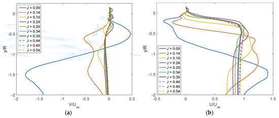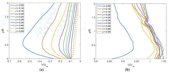 (a) Vertical velocity, ; and (b) the horizontal velocity, U/ below the center of the multi-rotor UAV ( = 92 mm), with respect to .