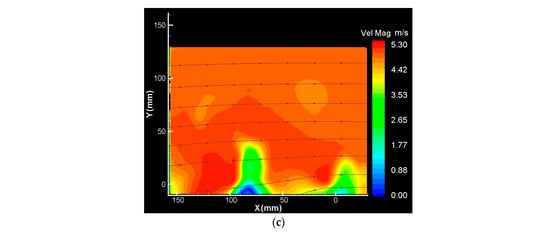 As the flight speed increases, the rotors have less of an effect on the flow above the multi-rotor UAV which can be seen in Figure 9a,b where Retip = 8 × 104 and is increased to 3 m/s (= 0.12) and 5 m/s ( = 0.20), respectively. At = 0.20, only the nearest streamline to the multi-rotor UAV is significantly deflected into the rotors. Additionally, the upper streamline within the FOV remains nearly parallel to the background flow, showing little signs of modification caused by the rotors. This shows that, even at high rotor speeds, is able to dominate the flow and the flow above the UAV remains relatively unaffected. A preliminary conclusion that can be drawn from this is that above the multi-rotor UAV is the optimal location for integration of in-situ instrumentation, especially when the unmanned vehicle is operated at 0.20.