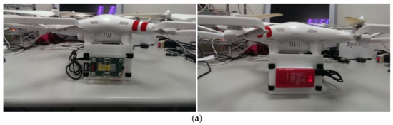 Once, the Krypto module is connected, two Wi-Fi cards are used with one care a wireless access point (AP) and one to monitor the received signal strength (i.e., RSSI). Figure 2 shows the main components of the Krypto module on different drones. In Figure 2a, the Krypto is mounted on DJI’s Phantom 2′s right-side landing gear and the portable charger on the left-side landing gear. Additional weight is added to balance both sides of the drone. In Figure 2b, the Krypto module is mounted on DJI’s M100 with a ribbon cable connected to M100′s COM port to control the flight path and download the status of the drone. The total weight of Krypto is 264 g which included all Krypto’s components, wiring, mounting brackets, and balance weights.