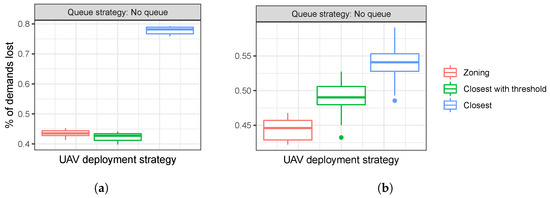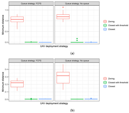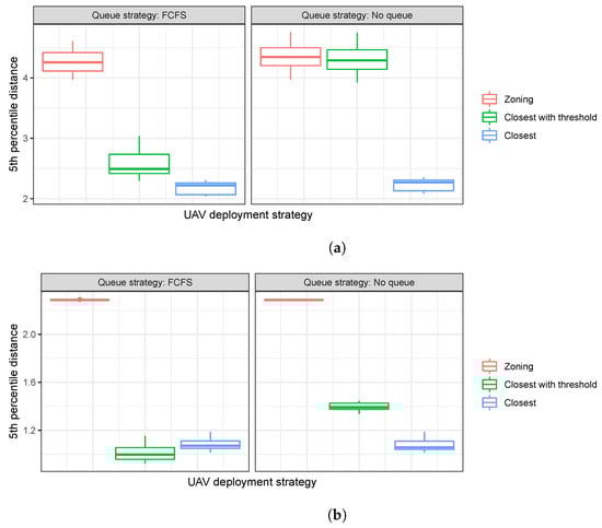 Figure 3 shows the distribution of the 5th percentile proximity values for 20 simulation runs under the four different problem classes and the three different UAV deployment strategies (zoning vs. closest vs. closest with thresholds).