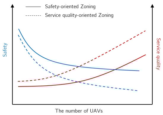 We also observed the trade-off between the performance criteria (safety vs. service quality) in the experiments, a natural phenomena of UAV-based service systems. To meet a desired service level of a UAV-based system while addressing this trade-off, further assistance from the tactical part of the UAV operation (e.g., UAV trajectory planning optimization) and a well-tuned zoning solution algorithm based on the system’s priorities are essential for successful implementation of the zoning approach for a UAV-based service system.