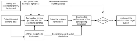 As reviewed, the concept of zoning has been addressed from different perspectives in the literature. In general, the zoning approach is designed to optimize the UAV performance for a single service instance (tactical/operational) under the area coverage class, whereas the zoning approach is applied to design a UAV traffic management system for multiple service instances (strategic) under the package delivery class. The zoning approach for the package delivery class is further separated by the restriction level on a zone. Sung and Nielsen [