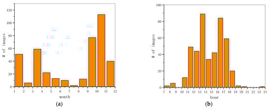 Image statics information. (a) The statistical histogram of shooting month; (b) the statistical histogram of shooting time from 7 to 24 o’clock.