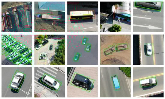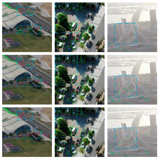 Reasons for occlusion in multi-view and down-view aerial images are completely disparate. There are a couple of block types in multi-view aerial images that will never exist in down-view airborne imageries, such as occluded by a building, being blocked by other vehicles, or being sheltered by shafts, such as flags (first line of Figure 13). Due to more types of occlusions, there are more hardships for multi-view aerial images to detect objects accurately in comparison with the down-view ones, which means the former is closer to real-world complicacies.