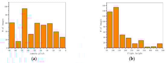 We graphed the distribution histogram of the camera pitch angles and flight heights of our dataset. As shown in Figure 5, due to careful selection, the distributions of the camera pitch angles were relatively uniform. However, because of the law restricting flight above 120 m, in most Chinese cities, the flight altitudes were generally concentrated between 100 and 200 m in VSAI. In contrast, images taken from 200 to 500 m were mainly centered in the suburbs, accounting for a relatively low proportion of VSAI. Moreover, due to the scale and shape changes of objects attributed to multi-view UAV images as shown in Figure 1, object detection tasks are closer to reality, but they simultaneously become extremely difficult.