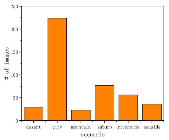 The statistical histogram of the VSAI scene distribution is shown in Figure 9. It is obvious that the urban scenario accounts for half of the VSAI dataset. The other five scenarios make up the other half. The histogram of the VSAI scene distribution exhibits the complexities of the VSAI dataset.
