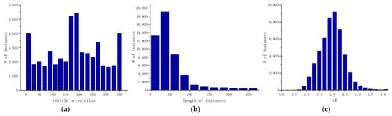 Vehicle statistics information: (a) the distribution of the vehicle’s orientation angles; (b) statics histogram of the instances’ lengths; (c) the distribution of the vehicle’s aspect ratio (AR).
