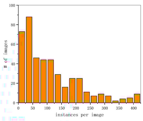 The main reason for this distribution is that the camera pitch angle decreases; that is, as the camera’s line of sight gradually approaches the horizontal plane, the larger the ground scene range corresponding to the image area of the same size, the farther the observation distance, and the more object instances can be included, resulting in more objects corresponding to the smaller oblique line of sight angles when there is no significant difference in the number of images at different pitch angles (Figure 7). This shows that the object instances are unevenly distributed with the observation line of sight angle under the multi-view observation condition. At the same time, this observation method will lead to large object scale variations and image blurring, which increases the difficulty of object recognition.