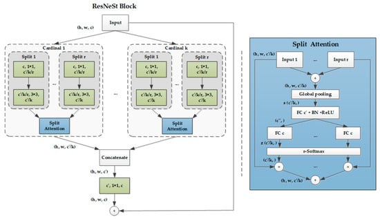 Based on the ResNeXt blocks [42] that divide the feature into groups (namely “cardinality” hyperparameter ), ResNeSt (Figure 15) introduces a new “Radix” hyperparameter , which means a split number within a “cardinality” group. Therefore, the total number of feature-map groups is . The group alteration is a 1 × 1 convolution layer followed by a 3 × 3 convolution layer. The attention function is composed of a global pooling layer and two fully connected layers followed by SoftMax in the “cardinal” dimension.