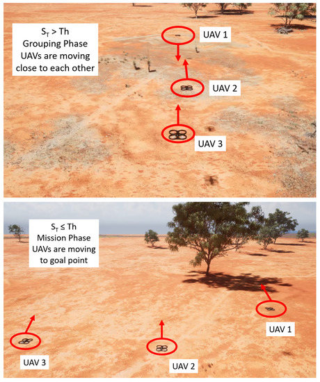 The velocity is calculated with the Velocity Verlet algorithm [46]. Since the simulation is performed on AirSim, it enables a straightforward transition to hardware in the loop. Three UAVs are used for the parameter trials, and three and six UAVs are used for multiple waypoint testing. The state variables are obtained through the ground truth API, which can be IMU-based when implemented on real hardware. A screenshot of the UAVs in the grouping and mission phases in AirSim is depicted in Figure 2.