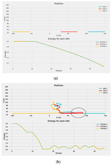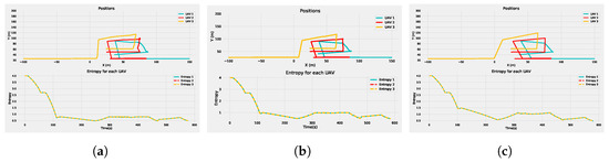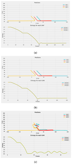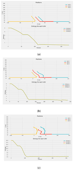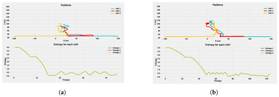 In this paper, the resulting plots have two parts; the top plots show the position of UAVs, and bottom plots show the entropy variations of UAVs (Figure 3). All of the UAVs have similar beginning paths in trials, as depicted in Figure 3a; all trials except Trial 3 output some backtracking motion, as shown in Figure 3b. The best graphic visualization of this backtracking is in Trial 6, where the UAV backtracking section is circled for clarity. Trial 9 and 12 only had the UAVs within 30 m of the waypoint compared to the 20 m for all other trials due to the minimum distance of 30 m. General trends are not significantly affected by this, aside from some influence on .