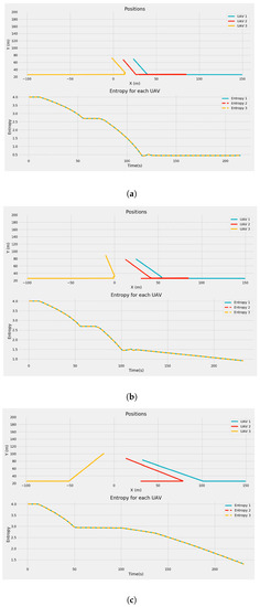 Trials 1–3, shown in Figure 4, were performed by varying the threshold parameter. Depending on the threshold value, the entropy of the system kept decreasing as UAVs got closer (grouping phase); then, they started going to the waypoint (mission phase). UAVs ended up closest in Trial 1 (Figure 4a) before going to the waypoint. This resulted in the highest cost for velocities, , and distance, , in comparison to Trial 2 and 3. As the threshold increased, the cost functions and decreased because less grouping resulted in lower velocities and lower overall distances traveled to the waypoint. Trial 2, in Figure 4b, had UAV 1 and 2 group closely together then backtrack before prioritizing the global waypoint.