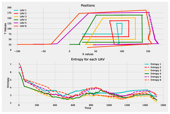 As new UAV agents are added to the system, they populate the environment in a linear pattern. As the multi-agent UAV team grows, so must the entropy threshold value. Close inspection of the entropy values for each UAV shows that as they move towards the first objective, they also reduce their entropy by decreasing the distance between each other. However, the system’s overall entropy ends up relatively higher than in the case with fewer agents. This makes sense due to the fact that system entropy takes agent distance from each other into consideration. If they are apart from each other, the entropy will be higher; if they are close to each other, the entropy will be lower. Further, the entropy value limits in a group with more UAVs will be higher than a group with fewer UAVs. Thus, entropy threshold values definitely need to be adjusted when changing the number of UAVs in the group.