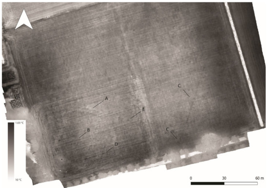 - James, K.; Nichol, C.J.; Wade, T.; Cowley, D.; Gibson Poole, S.; Gray, A.; Gillespie, J. Thermal and Multispectral Remote Sensing for the Detection and Analysis of Archaeologically Induced Crop Stress at a UK Site. Drones 2020, 4, 61. [Google Scholar] [CrossRef]