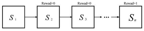 In the task designed in this paper, the only goal of the UAVs is to destroy all target ships. At this time, the greatest reward should be given to avoid the main task being covered by other subtasks. In this paper, the entire cluster obtains a 100 reward when destroying a target ship, and a UAV obtains a −10 reward when it is knocked out by ships. At the same time, in order to prevent the sparse reward problem shown in Figure 5 [27] and improve the sampling efficiency, this paper adopts the guidance reward based on the heading angle. As shown in Equation (7), the guidance reward is calculated from the included angle between the ideal heading angle and the current actual heading angle, and the smaller the included angle, the greater the reward.