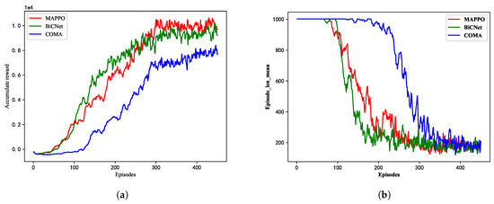 The training curve of the UAV cluster: (a) Average accumulated reward; (b) The number of steps required for each episode.