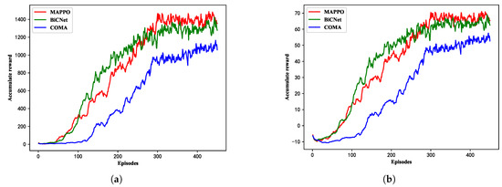 It can be seen that the PPO algorithm cannot converge in the complex heterogeneous multiple-UAV environment. Based on the centralized training and distributed execution, the MAPPO algorithm achieves stable convergence and obtains a high average accumulated reward, which proves the effectiveness of the algorithm proposed in this paper.