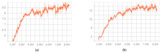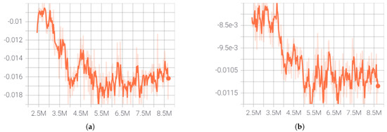 The addition of action entropy can make the policy more random, reduce the sensitivity of the algorithm to model and estimation errors, and make the algorithm more robust. As shown in Figure 12 (the abscissa is the number of steps, the ordinate is the entropy loss value), the policy entropy curves of detectors and fighters show an upward trend in the initial stage of training, indicating that the agent is constantly trying to discover new actions and finally converge to a stable state, which fully shows the effectiveness of the improvement in this paper.