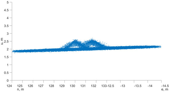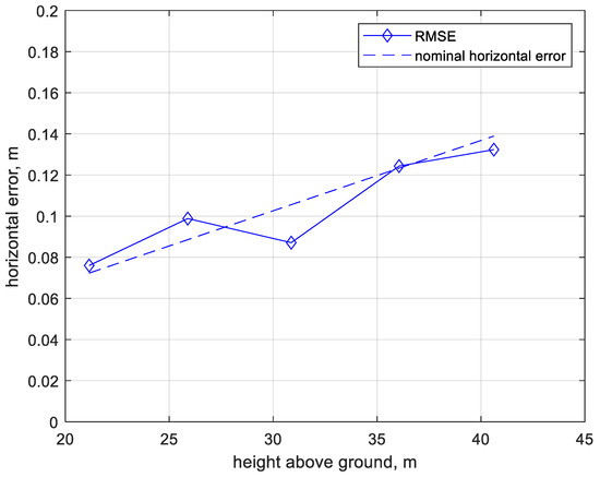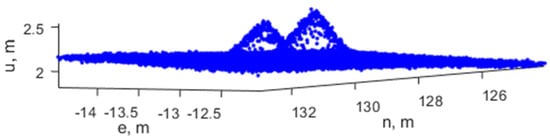 It is evident from comparing Equations (11)–(15) that the LIDAR is the dominant error source ( for point x. Since the majority of is considered a random process that is independent among points, as mentioned earlier, the integration and synchronization with the navigation measurements does not introduce substantial systematic errors in the LIDAR point. As a result, the error magnitude is on the order of 0.1 m for both horizontal and vertical directions in a typical low-altitude flight.