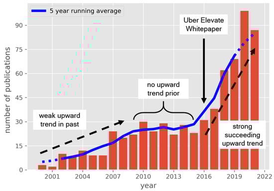 To gain a feeling for the trend of each keyword (see Table 1), three time spans and sub-databases were looked at in particular: the last two decades, the last 10 years, and the years after 2016 which marked a turning point due to the publication of the UAM white paper by UBER Elevate [27] (see Figure 1). The number of publications in each sub-database is shown as well in Table 1. The size of the database does not have to match the sum of the occurrences of all keywords for various technical reasons: for example, one paper could contain multiple keywords from the list.