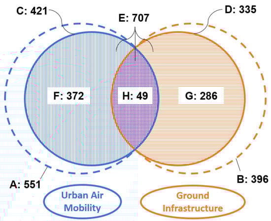 As the focus of this review is ground infrastructure in the context of UAM, the same search was then applied to the keyword of “urban air mobility” (equals database “urban air mobility”). The goal of this analysis is to find the best-fitting keyword for ground infrastructure in the context of UAM, which is done by comparing the two databases derived from Scopus. In Figure 2, the overlap of these two databases is visualized. Set A and B represent the UAM and ground infrastructure database, respectively. The comparison of two sets is conducted by looking at DOIs as unique identifier. As not all listed entries carry a DOI, these entries are removed, yielding the sets C and D representing the cleaned databases for UAM and ground infrastructure, respectively.