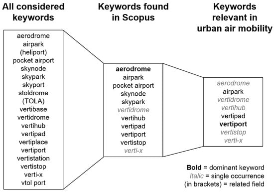 Applying a document term matrix approach, the number of occurrences of each keyword in the final database can be highlighted (see Table 3). A document term matrix shows how often each keyword occurs in each publication. The number of hits shown are the sum of occurrences across all 49 publications. It can be seen that “vertiport” occurs in 40 of the total 49 publications and therefore covers over 80%. Vertiport is the most prominently used term or keyword to describe UAM ground infrastructure. This is in direct contrast to the wider field of aerospace research where “aerodrome” (296 occurences in the last 6 years) appears to be the more prominent keyword while “vertiport” is used less often (60 occurences in the last 6 years) as can be seen in Table 1. Yet, the keyword “aerodrome” has negligible relevance in the UAM community (1 occurence in the context of “urban air mobility”, see Table 3). The process of selecting keywords describing ground infrastructure and finding the overlap with the body of research concerned with UAM is summarized in Figure 3.
