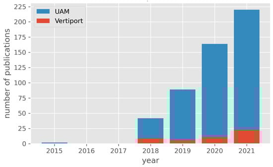 Publications related to UAM ground infrastructure as listed in Scopus after the year 2000 and in relation to the publication of UBER’s whitepaper in 2016 [27].