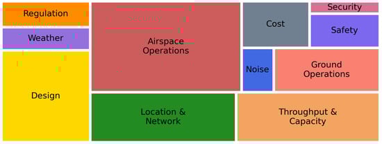 Classification of vertiport-related topics and their weight in the reviewed scientific literature (49 publications); size of rectangle corresponds to prominence of the topic.