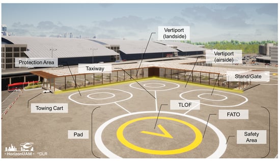 - Schweiger, K.; Knabe, F.; Korn, B. Urban Air Mobility: Vertidrome Airside Level of Service Concept. In Proceedings of the AIAA AVIATION 2021 FORUM, Virtual Event, 2–6 August 2021. [Google Scholar] [CrossRef]