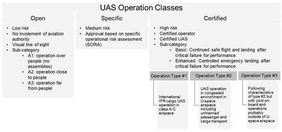 European UAS operation classes, subcategories and types based on [41,43,44].