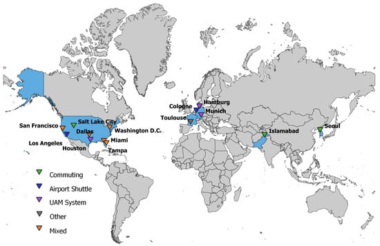 - Ploetner, K.O.; Al Haddad, C.; Antoniou, C.; Frank, F.; Fu, M.; Kabel, S.; Llorca, C.; Moeckel, R.; Moreno Chou, T.; Pukhova, A.; et al. Erforschung des Langfristigen Anwendungspotenzials von Urban Air Mobility als Ergänzung zum öffentlichen Personennahverkehr am Beispiel Oberbayern (OBUAM). Available online: https://www.bauhaus-luftfahrt.net/fileadmin/user_upload/OBUAM_Final_Project_Review_external_kom.pdf (accessed on 16 April 2020).