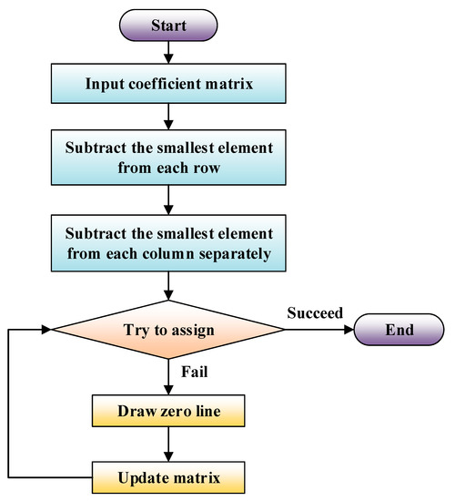 Task assignment is of significance for multi-UAV trajectory planning, while for solving assignment problems, the Hungarian algorithm happens to be a very effective method with fast calculation and high efficiency. Therefore, this paper applies the Hungarian algorithm for the task allocation (assignment) of multiple UAVs to achieve the objective of obtaining the shortest total flight distance of all UAVs, as shown in Figure 2.