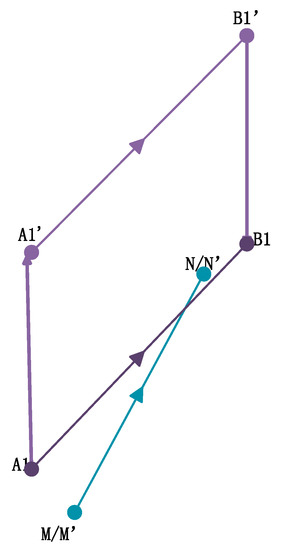 Safety constraints require the distance between UAVs to be greater than or equal to the safety distance until they arrive at the target point to avoid collisions. Due to the large granularity of scattered waypoints, not only safety constraints at waypoints but also the safety of the entire trajectory within the same period should be determined. Specifically, and are set to represent the trajectories at the first and second waypoints of UAVs and , respectively, and the coordinates of point are set to be , point , point , and point . Safety constraints between the two UAVs are displayed in the following steps: