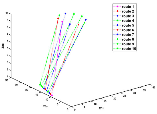 - Clear arrays , , and , and move the positions of the initial and target points to the next section of the trajectory (for instance, set the first and the second waypoints of all UAVs as the initial and target points at the very beginning, and then take the second and the third waypoints as the initial and target points). Repeat steps 1 to 10 until the distances between trajectories of all UAVs have been checked. At this point, the algorithm ends, and multi-UAV trajectory obstacle avoidance is completed.