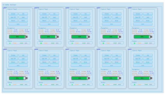 In Figure 15, each card in the above diagram represents a UAV, and the status related to each UAV (including latitude and longitude information, battery voltage, and flight mode) can be observed clearly.